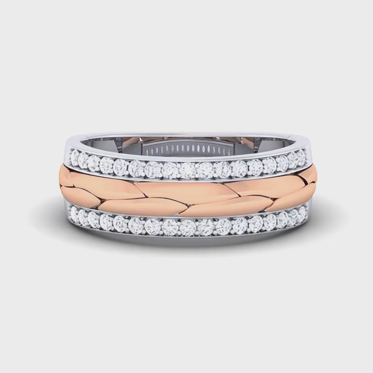 This elegant American Diamond Band features round cut American diamonds set in a stunning pave setting, offering exceptional sparkle. The ring showcases a unique pebble texture design and is crafted with dual tone jewelry, combining rose gold plating and white gold plating for a luxurious two tone effect. Made from high quality sterling silver, the ring offers durability while maintaining a refined look. Perfect for special occasions, this piece of women's jewelry blends modern sophistication with timeless appeal. Its organic texture and shimmering diamonds make it a standout accessory for any jewelry collection.