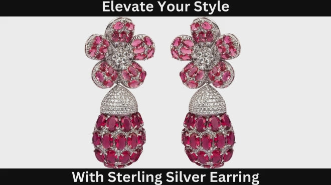 Elevate your elegance with these Ruby Mosaic Floral Drop Earrings, crafted for timeless sophistication. The top features a stunning five-petal flower motif adorned with oval-cut pink ruby earring, encircled in white gold plating and centered with pavé-set American diamonds for dazzling brilliance. Below, a sleek dome encrusted with American diamonds gracefully transitions into a bold, egg-shaped drop, intricately studded with deep red oval-cut lab-created rubies. Set in a rich lattice pattern with white prongs and delicate diamond accents,