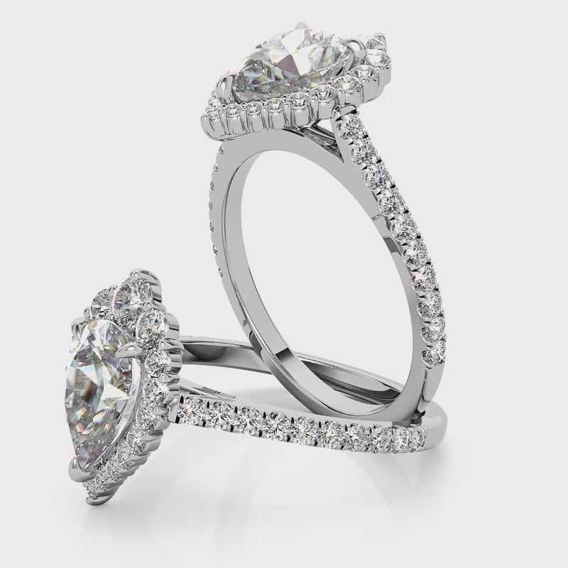 This stunning white gold plated ring features a beautifully pear cut shaped american diamond as its centerpiece, designed to captivate with its elegant brilliance and timeless charm. The central stone is expertly set in a secure 3 prong setting, allowing maximum light to pass through and enhance its sparkle. Encircling the main stone is a delicate halo of smaller american diamond stones, adding an extra layer of shine and sophistication. The design continues gracefully along the half shank of the ring, which is adorned with matching american diamonds for a seamless, sparkling look across the finger. Its stackable ring design allows you to wear it alone for a classic, refined statement or pair it with other rings for a more layered and contemporary style. This ring comes with a matching stackable band, which you can wear together with the main ring for a complete stacked look, or style separately on other fingers for added versatility. Made from premium sterling silver and finished with a durable white gold plating, the ring offers both luxury and long-lasting shine. The adjustable shank ensures a comfortable and flexible fit, making it suitable for various finger sizes without compromising on style. Perfect as a bridal ring, engagement accessory, or a dazzling piece for special occasions, this ring combines fine craftsmanship, elegant design, and affordability making it an ideal choice for those seeking refined beauty with lasting value.