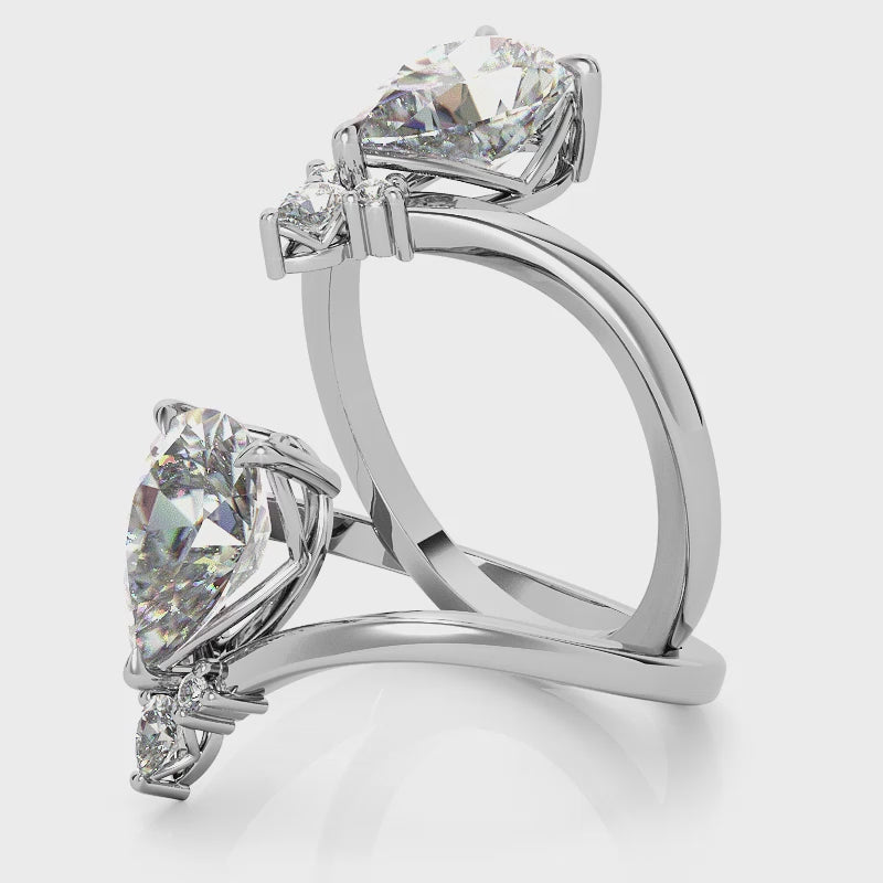 This beautifully crafted ring features a captivating pear shaped american diamond as its centerpiece, securely set in a classic three prong setting that enhances its brilliance. Attached just below the main stone are three small american diamonds, adding an elegant sparkle and graceful balance to the design. The ring showcases a clean and minimal V shaped plain shank, offering a modern silhouette that complements the overall refined look. Made from premium sterling silver and finished with a sleek white gold plating, this ring ensures both durability and sophistication. The adjustable shank guarantees a comfortable fit for various finger sizes. A perfect blend of simplicity and elegance, this piece is a standout in silver ring design and a must have for those who appreciate modern rings.